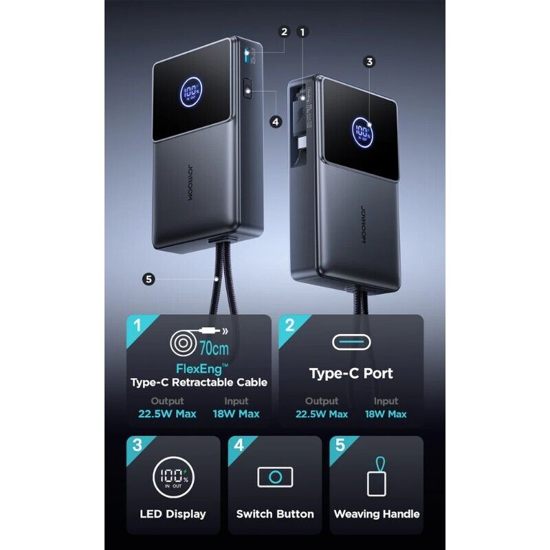 The JoyRoom JR-PR1 is a slim 10,000mAh portable power bank designed for convenient everyday charging. It features a built-in retractable USB-C cable and supports up to 22.5W fast charging, allowing two devices to be charged at the same time.